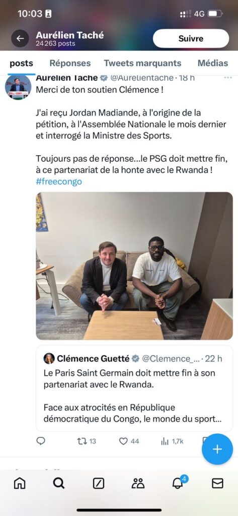 « Le Paris Saint-Germain doit mettre fin à son partenariat avec le Rwanda. Face aux atrocités en République démocratique du Congo, le monde du sport ne peut rester complice. À l’initiative d’un supporter de Choisy-le-Roi, une pétition est lancée », peut-on lire sur le compte X de Clémence Guette, Députée de l’Assemblée nationale de France.